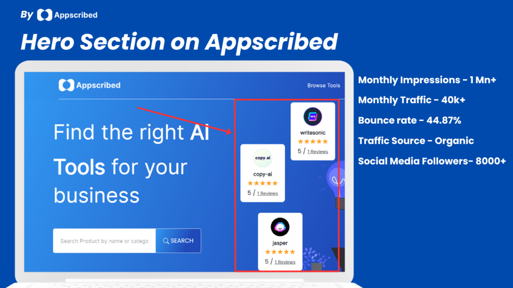 Appscribed's Hero Section is the place where your SaaS product gets the spotlight on our homepage. The Featured product shows up at the beginning of the home page, grabbing everyone's attention. We showcase up to three products at a time in the Hero Section, making sure your brand is front and center.